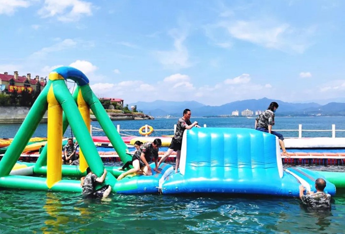 經過一晚的休整,第二天,團隊迎來了新一輪的比賽。這次以公司為單位,大家分成了潔能、生產、平臺三個隊伍。比賽共計三輪:水上鋼琴、皮劃艇競賽、水上闖關。