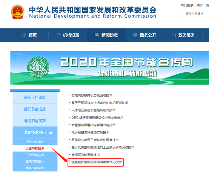 安徽科達潔能“模塊化梯級回熱式清潔燃煤氣化技術”作為節(jié)能宣傳周工業(yè)節(jié)能技術之一在國家發(fā)改委官方網(wǎng)站上進行了“云”上展示,分別從技術原理、技術指標、節(jié)能效果、應用領域等方面進行了全方位介紹。