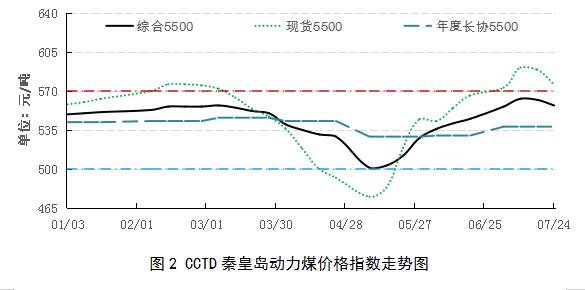 截止2020年7月24日,CCTD秦皇島動力煤綜合交易價格報收于557元/噸,較年初上漲1.5%,較去年同期下跌3.5%。