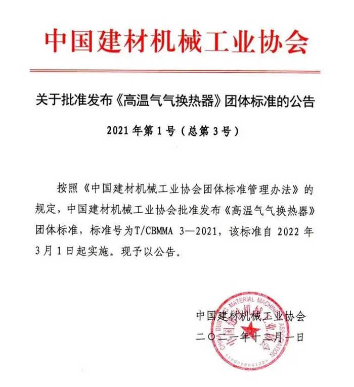 近日,中國(guó)建材機(jī)械工業(yè)協(xié)會(huì)發(fā)布公告,由安徽科達(dá)潔能股份有限公司、清華大學(xué)山西清潔能源研究院等主要負(fù)責(zé)起草的T/CBMMA 3—2021《高溫氣氣換熱器》團(tuán)體標(biāo)準(zhǔn)獲批發(fā)布,自2022年3月1日起實(shí)施。