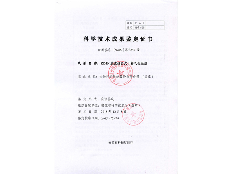 旋流撞擊式干粉氣化系統(tǒng)鑒定證書
